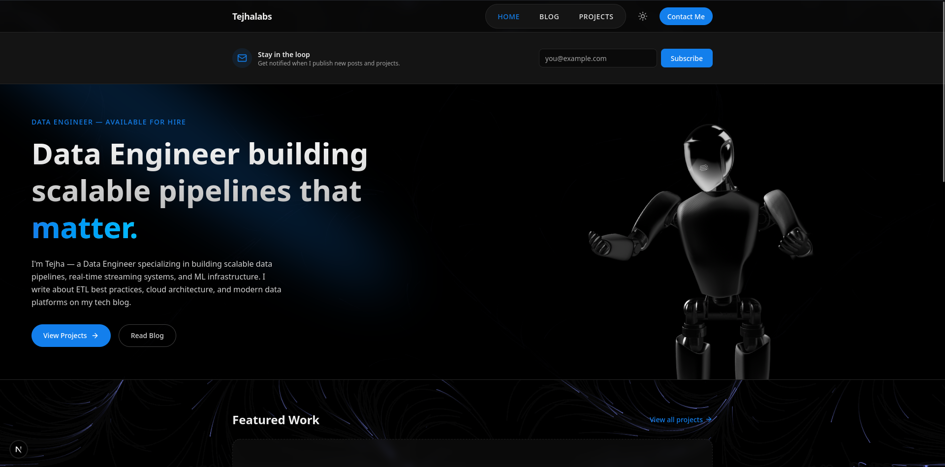 I'm Tejha — a Data Engineer specializing in building scalable data pipelines, real-time streaming systems, and ML infrastructure. I write about ETL best practices, cloud architecture, and modern data platforms on my tech blog.