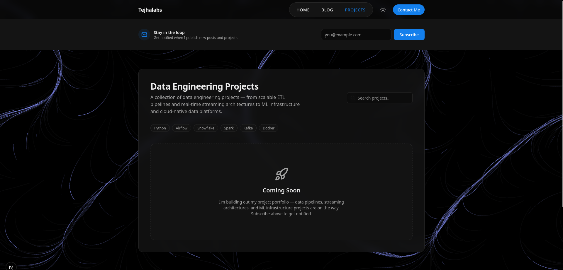 - A dark-only personal portfolio and tech blog